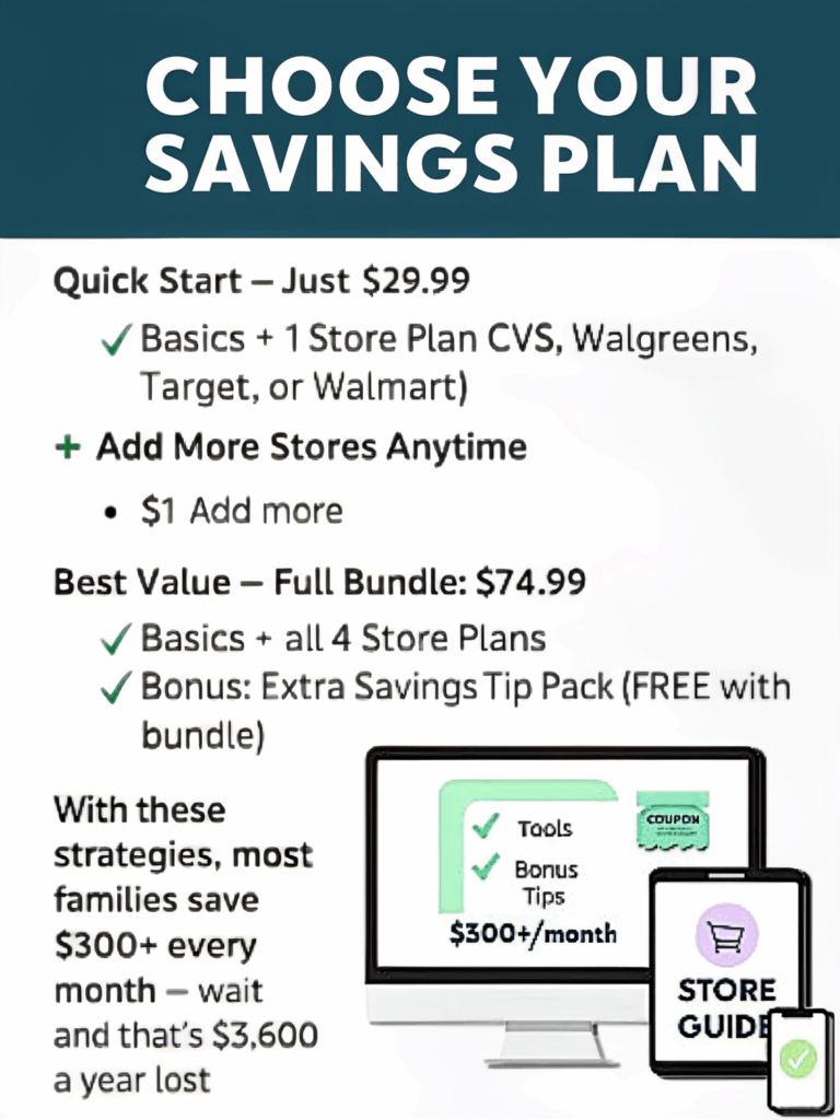 With these strategies, most families save $300+ every month – wait and that’s $3,600 a year gone for good. For just $74.99, the bundle pays for itself on your very first month.